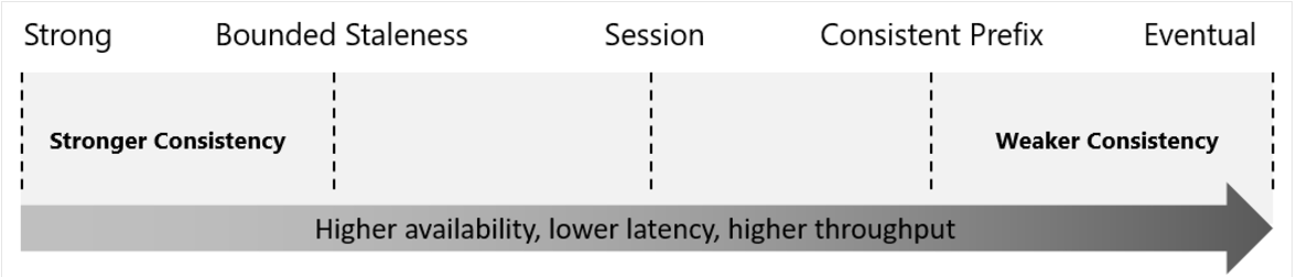 - Consistent prefix consistency: updates made as single document writes sees eventual consistency, and updates made as a batch within a transaction are returned consistent to the transaction in which they were committed.
